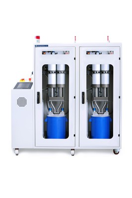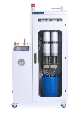 VA10068Unità di alimentazione per l'estrusione di materiali altamente abrasivi e ad alta viscosità. Alimentazione del materiale da fusti di 20 litri con piatto premente sotto vuoto Scheugenpflug brevettato.